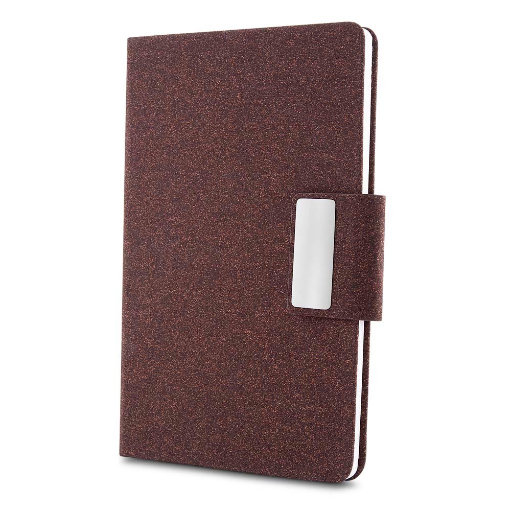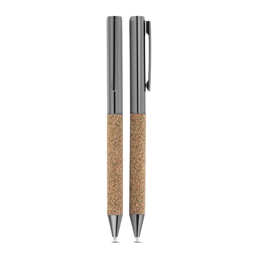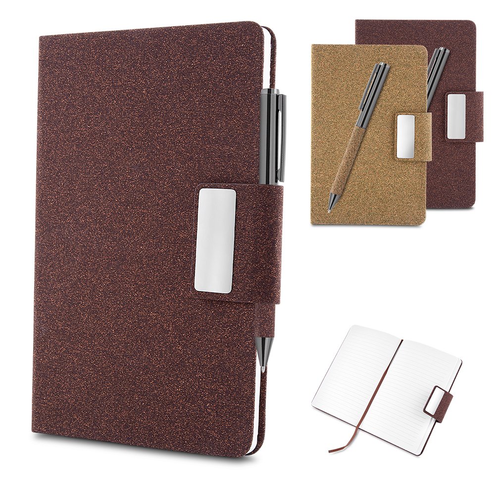 Kit de Escritório composto por caderno tamanho A5, com capa em PU e detalhe em fibra de chá ou café, contendo 80 folhas pautadas de 70g/m². Acompanha caneta metálica com acabamento no mesmo material de fibra, formando um conjunto elegante e sofisticado. O kit acompanha estojo de papelão na cor preta.