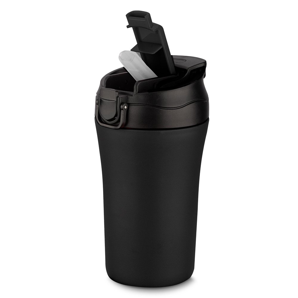Copo térmico com parede dupla de 500 ml, saída de líquido tanto por sucção (canudo) como por bico, com base revestida de borracha antiderrapante. 17,5xø8cm (AxøD)