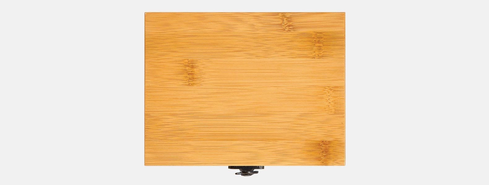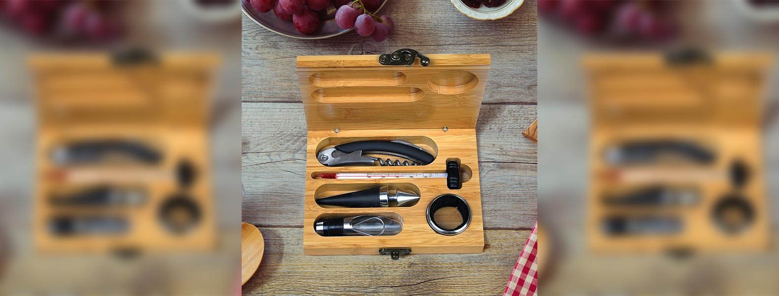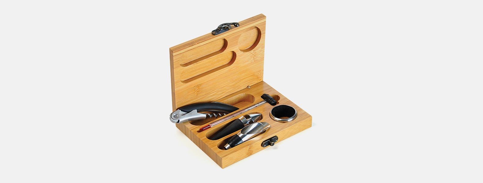 Kit para vinho. Composto por cinco acessórios para vinho em metal e inox, sendo um anel corta-gotas, um funil direcionador com tampa e tampão, ambos com detalhes emborrachados para melhor fixação na garrafa, um termômetro e um abridor saca-rolhas modelo sommelier de alavanca simples com três funções acomodados em um estojo em bambu.