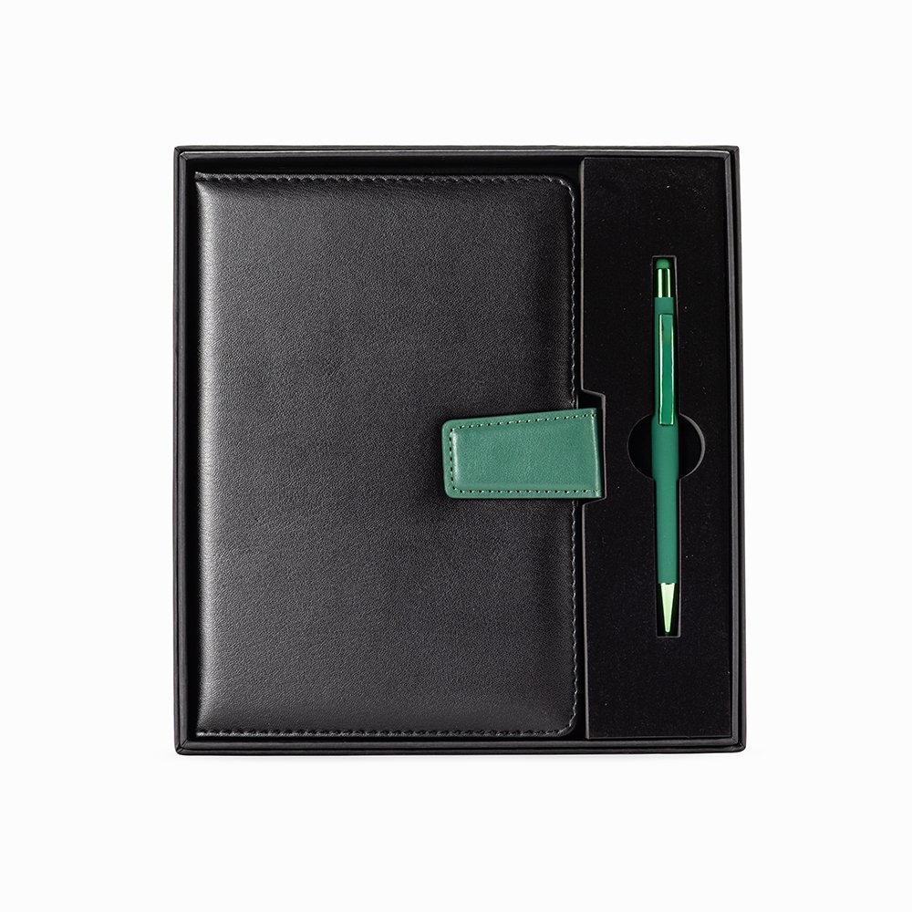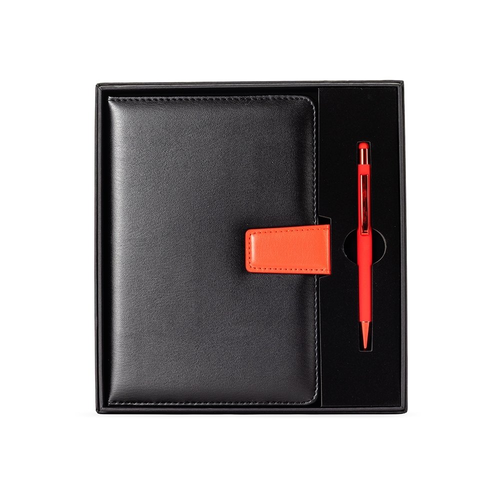 Kit executivo com duas peças, composto por uma caderneta de capa em couro sintético com fechamento magnético e cerca de 80 folhas pautadas, e uma caneta em metal com detalhes em plástico, ponteira emborrachada para uso em dispositivos touchscreen e carga esferográfica azul de 1,0 mm. Acompanha uma caixa de papelão com berço em espuma para a caneta.