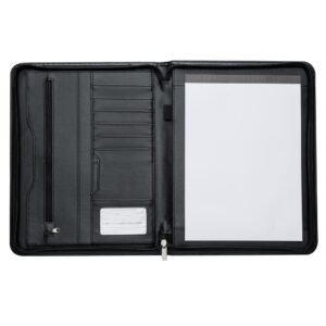 Organização impecável com estilo profissional. Nossa pasta executiva, feita em couro sintético de alta qualidade, acompanha um bloco de aproximadamente 20 folhas pautadas removíveis para anotações, suporte para caneta, bolsos para organizar folhas ou documentos, suporte para cartões, incluindo um com visor de identificação. Além disso, possui fechamento magnético, unindo praticidade e elegância em um único produto.